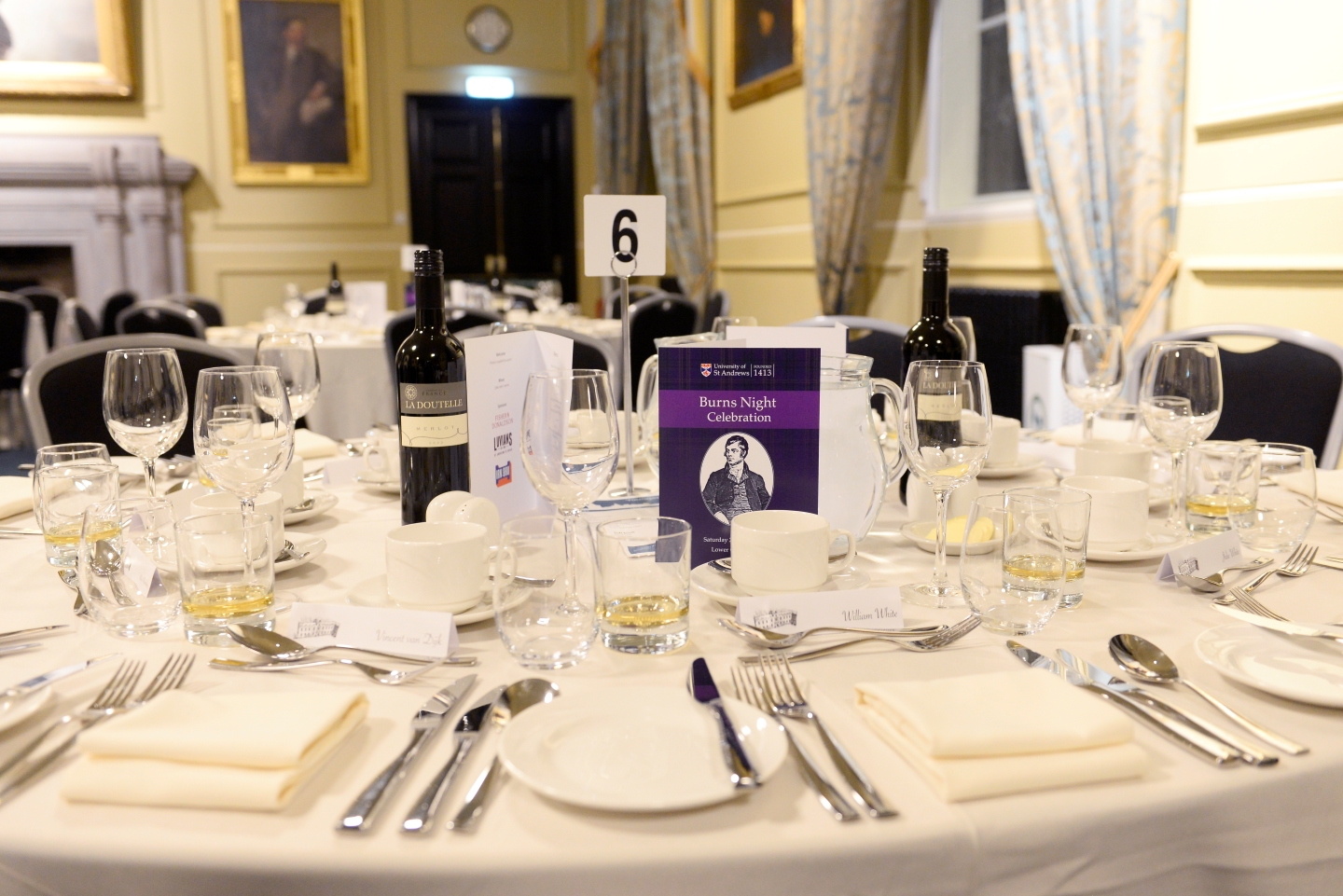 The evening will begin at 6.15pm with a welcome drink in the grandeur of Lower College Hall, which will be followed by a four course Taste of Scotland Dinner including a haggis course, a dram of whisky and half bottle of wine per person.
