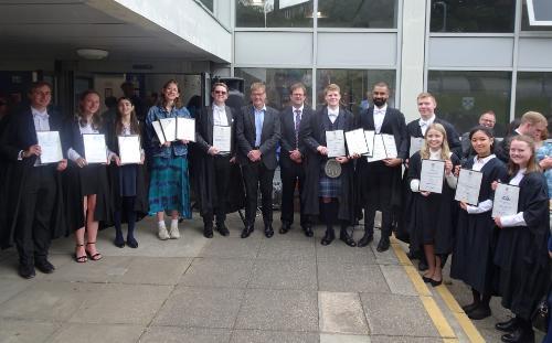 (L-R) Toby Fairs, Corinne Vallis, Anna Johnson, Hannah Weiss, Harry Burrows, Professor Chris Baddeley (Head of School), Dr Gordon Florence (Director if Teaching), Fraser Bell, Udeyveer Dhaliwal, Marek Karpisek, Monika Davies, Lian Leung, Emma Petersen