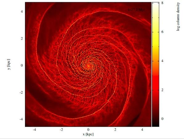 Observations show that stars form inside dense and cold gas structures named molecular clouds. These clouds can be several light years wide and can have masses up to a few million solar masses, at least in our Milky Way. These clouds typically lie on the plane of the galaxy. The gas in molecular clouds has a temperature near 10K and are traced by the emission of the 12CO molecule in the J=1-0 line. Molecular clouds are expected to be mostly composed of H2, but they may contain other molecules and dust particles. On the other hand, the warm gas in a galaxy is mostly composed of atomic hydrogen, distributed in a disc an in the same plane as the stellar disc. For example, our Milky Way disk has a radius of approximately 50000 light years, so most of the galaxy’s gas is distributed over a large scale compared to the typical sizes of molecular clouds. However, stars form on scales smaller than a few light years. This brings us to the following question: what is the role of large-scale galactic gas motions in the formation of stars? To address this question, we have to study the interplay of several mechanisms that can drive gas from the large galactic scales to the smallest scales of molecular clouds, where stars form. Observations show that many galaxies have spiral arms, which tend to be traced by dense molecular clouds and star forming regions. This indicates that the large-scale structure of the galaxy plays an important role in the process of star formation. However, the exact dynamics of the gas in an arm will be sensitive to the nature of the underlying spiral arms (density waves or dynamic arms). Therefore, in order to understand star formation from a galactic perspective, we have to explain how spiral arms drive the formation of molecular clouds. Computational simulations are best suited to address this problem.