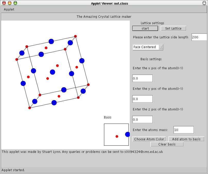To use the applet, you require a web browser which a java plugin later than 1.2 (note it has not been tested with 1.2 - only 1.3.1 and 1.4), for example the latest JRE from Sun or Apple's JDK on Mac OS-X. You can also use the AppletViewer provided with your chosen JRE/JDK. It is not recommended that you use a remote X-session to run this applet as it draws to the screen a lot and the resulting lag makes the animation jerky. Installation Unpack the applet - if it came with a group of other applets from the School of Physics at the University of Edinburgh, it should be in the crystal subdirectory. Inside the crystal directory should be some java code, classes and a number of html files, including an index.html which should contain links to this documentation, JavaDoc for the simulator and some pages with example configurations of the applet. Usage The provided html files give you some example configurations of the applet. You can set the size of this applet as usual. Below is an example html file which embeds a tabbed 800 pixels by 600 pixels version of the applet.