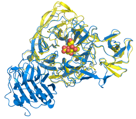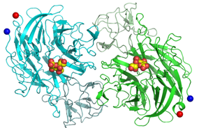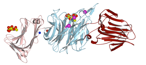 Sialidases (neuraminidases) remove sialic acid, a 9-carbon carbohydrate that decorates cell surfaces as the terminal sugar of various glycoconjugates. Baterial sialidases come in may sizes. Some just contain the beta-propeller catalytic domain, others have additional carbohydrate-binding modules (CBMs) that often recognize sialic acid and help the enzyme target its substrate on cell surfaces. Most are monomers, but below we have examples of a dimer and a trimer. We are engaged in structure-based drug discovery of the S. pneumoniae and P. aeruginosa enzymes, knockouts of which severely reduce pathogenicity in mouse models. NMR studies have been carried out in collaboration with Jenny Wilson & Milton Kiefel, Griffith University, Australia.