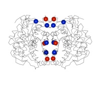 A comparative structural study was undertaken to establish the basis of heat and cold tolerance. Citrate synthase was used as a model enzyme, and structures were determined from organisms spanning the temperature rang eat which life is found: 0C to >100C. Factors such as networks of ion paris (shown below) and removal of internal cavities correlated with increasing temperature. This study was in collaboration with Mike Danson & David Hough at the University of Bath.
