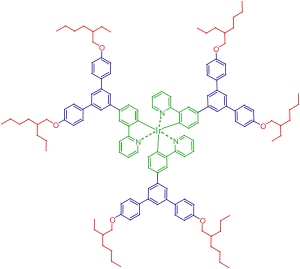 Chemical structure of an iridium dendrimer. The core (green) controls the photophysical properties, the dendrons (blue) control the distance between neighbouring cores and so morphological properties, and finally the surface groups (red) control the solubility and environmental interaction of the material.