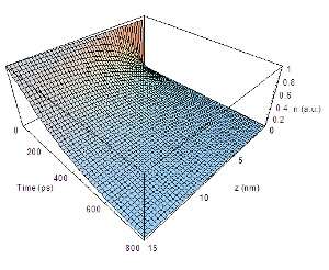 The output from the diffusion model for a 15 nm thick film with the quencher at z = 0. This greatly reduces the number of excitons in the surrounding film.