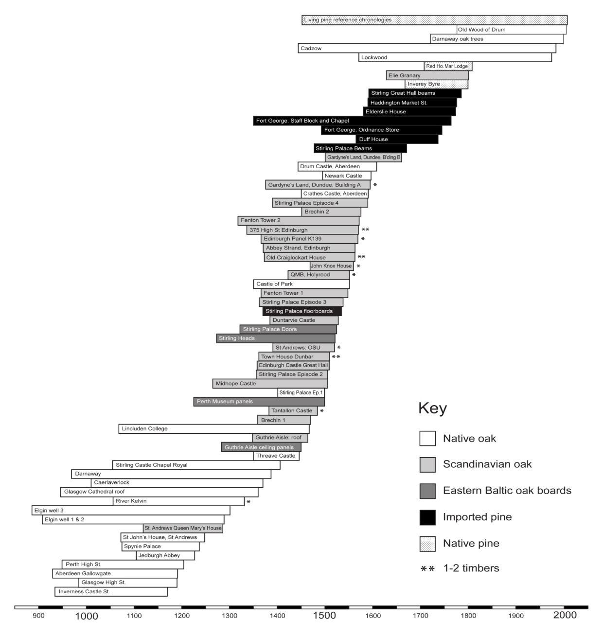 Sampling pine timbers at Eaderloch Crannog ; sequences measured but not yet dated Pine-built cruck cottage in Upper Speyside; tree-ring samples measured but so far undated (Mills 2013) The figure below shows a snapshot of the Scottish historical tree-ring record for the last millennium, as it stood in 2012 (excluding loch sub-fossil material). Each bar represents a dendro-dated site (buildings and archaeology), with time on the horizontal axis. The shading shows whether the material is oak or pine, native or imported. Some key living-tree reference sites are included at the top. Taken from Mills & Crone 2012, Figure 1.