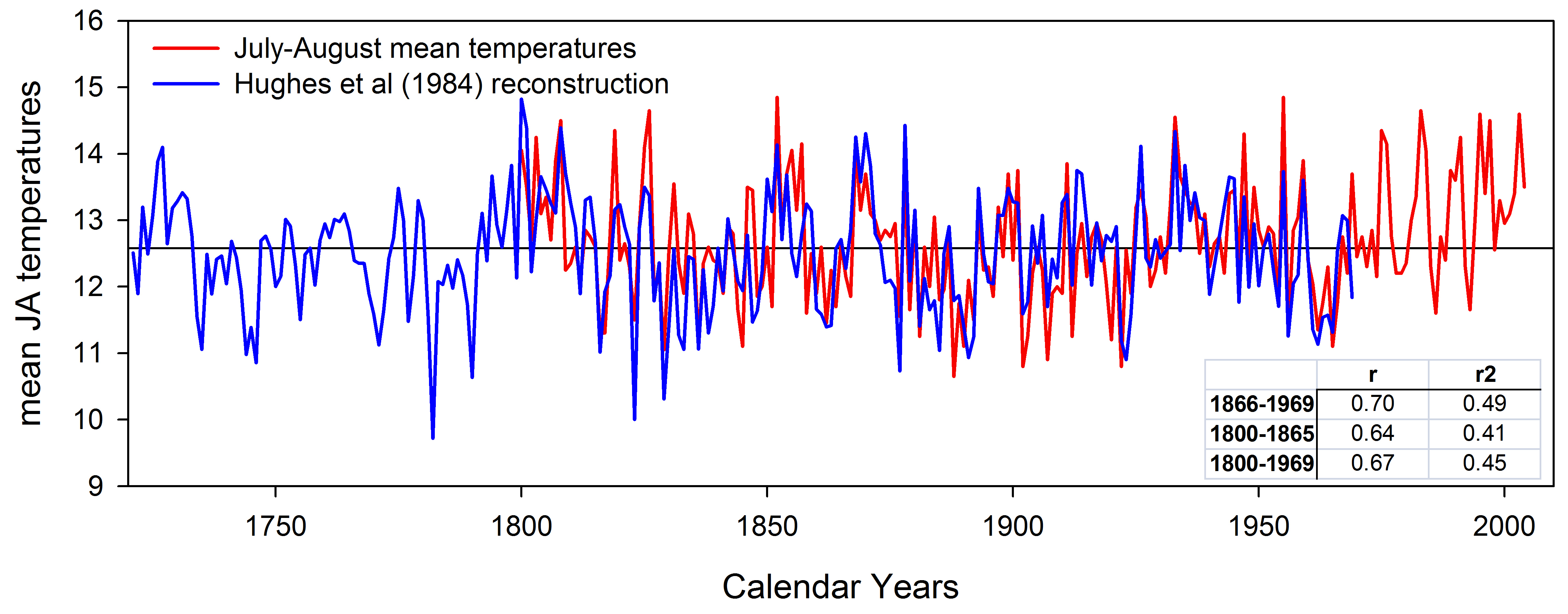 In 1984, Malcolm Hughes of the Tree-Ring Laboratory of the University of Arizona, published in Nature a tree-ring (ring-width and maximum density) based reconstruction of Edinburgh summer temperature going back to the early 18th century. The original Scots pine trees were sampled in the 1970s (see Living data) and no update of this work was undertaken until recently. The original Hughes reconstruction is shown below showing the excellent calibration potential of this species in the Scottish Highlands. Although some success has already be made in finding older living sites (see Living data), the truly exciting work will be related to extension of the living material with either historical or sub-fossil material.