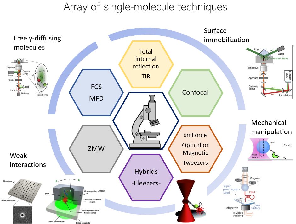 The two schemes below show the main biology areas in which we are currently working and the main single-molecule biophysical tools available in our labs in the School of Physics and the Shool of Biology: