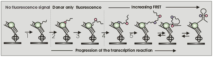 We aim to develop a new experimental framework by simultaneous combination of single-molecule fluorescence, microfluidics and stepwise transcription that will allow an unprecedented characterization of nascent RNA and its interactions with the rest of elements involved in the transcription scaffold. The single-molecule transcription technique will allow for the first time to monitor the folding of any RNA molecule in real-time during the transcriptional process at the nucleotide resolution.According to this methodology and once the FRET dyes have been incorporated into the nascent RNA following the stepwise assay, two distinct readout regimes can be followed: (i) static regime or structure snapshot, where the transcription is halted at a certain position and the folding dynamics of that particular transcribed portion is examined for a period of time by recording the fluctuations on the FRET signal and (ii) real-time regime where after the donor and acceptor dyes have been incorporated, the transcription is allowed to run in normal mode. Thus, we can monitor in a single trace the progression of the transcription reaction and its effect on the folding dynamics of that particular RNA region following the changes in the donor and acceptor signals. This project is in collaboration with Prof. Daniel Lafontaine: Lafontaine's Lab