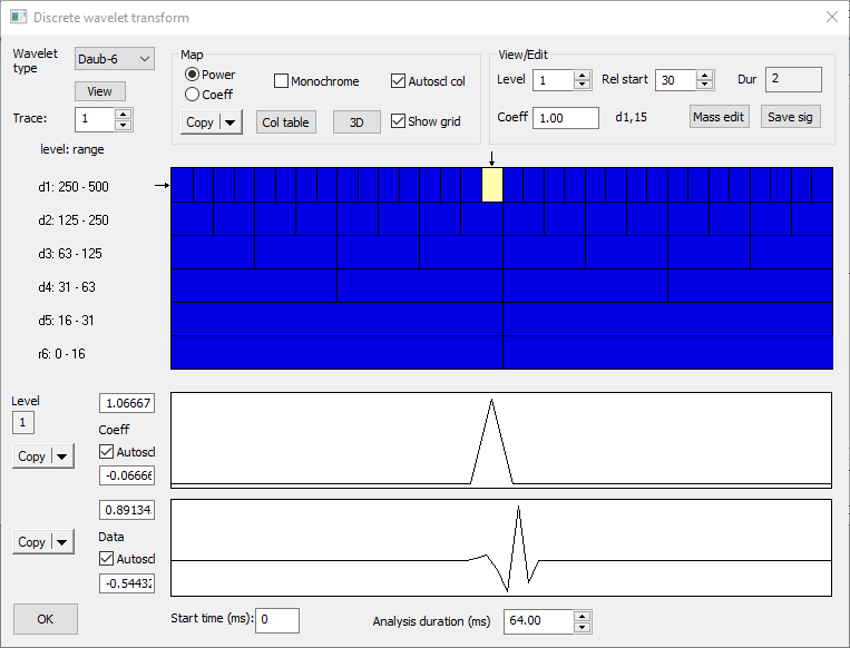 In the View/Edit frame at the top-right of the dialog box you will see the Level box shows 1, the Rel start box shows 30, and the Dur box shows 2 and the Coeff box shows 0. The Level value refers to the top row (detail level 1) of the map, and, as indicated at the left of the map, this represents frequencies in the range 250-500 Hz. Note that this is quite a large range of frequency, so the frequency information is not very precise. The Rel start value tells us that we are looking at a time location 30 ms after the start of the record. The Dur value tells us that the coefficient applies to just 2 ms of the data. Note that this value is quite small, so the location information is quite precise (the trade-off between information in the time and frequency domains). The Coeff value tells us that the raw data has no power corresponding to the Daub-6 mother wavelet at this location and frequency. By convention, this coefficient is given the identifying notation d1,15, indicating that it is coefficient 15 (the index is 0-based) in detail level 1, and this is indicated beside the Coeff edit box.